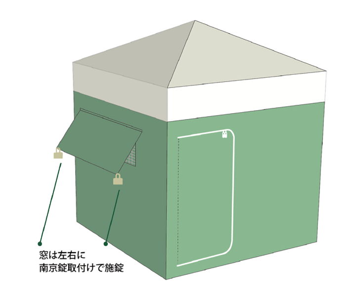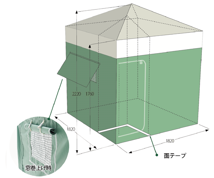入口はファスナー開閉の二重扉、左右にある窓部は巻き上げ式の二重窓で通気性・採光とプライバシーの保護を両立。